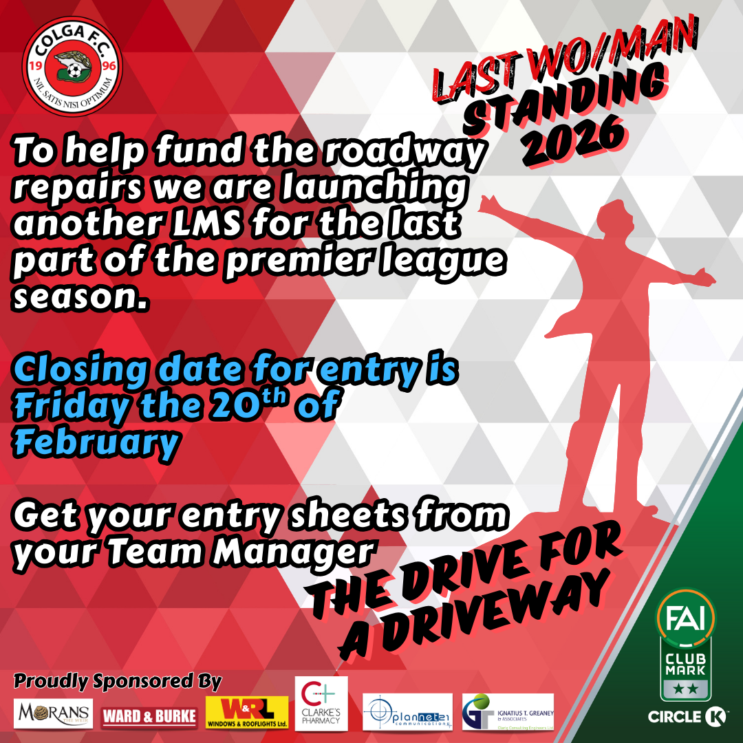 We are launching a LMS to help fund the driveway costs. The closing date for entries is 20th February and you can get your sheets from your team manager but you can also download the form by clicking on the link below. Let's get those entries in and save those suspensions!